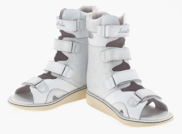 Сандалии изготавливают из нат.кожи. Обеспечивают их жесткой задней частью и берцами, которые отлично поддерживают стопы при их отклонениях. Высокий берец необходим для иммобилизации движения голеностопа. Это дает возможность суставам развиваться правильно или предотвращает развитие деформаций, эффект достигается при регулярном ношении.